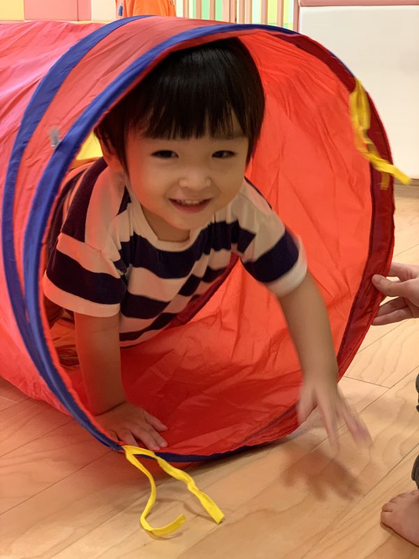 室内遊びの際にトンネルとマットを組み合わせたサーキットを作ると大盛り上がりでした![]()
