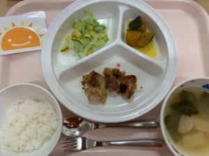 ご飯 味噌汁 ローストチキン コーンサラダ かぼちゃの甘煮