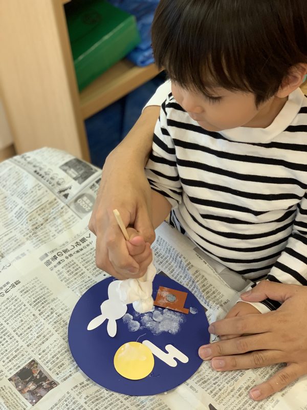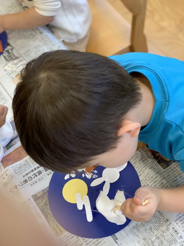 制作では、丸い台紙にウサギとお月様を張って、お団子を絵の具で描きました![]()