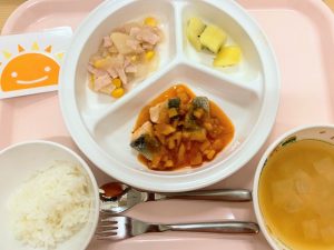 ご飯 味噌汁 魚のバーベキュー ジャーマンポテト キウイ