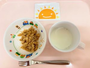 ※今日のおやつは、定番のマカロニあべかわでした。茹でたマカロニに、きな粉さとうをまぶせば出来上がり♪簡単でおいしいおやつです。