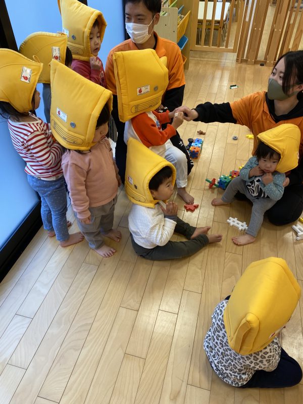 保育士の「じしんだー」という掛け声で一斉に安全な場所まで集まります![]()