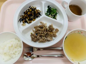 ご飯 味噌汁 豚のしょうが焼き ひじきの炒り煮 小松菜のおかか和え