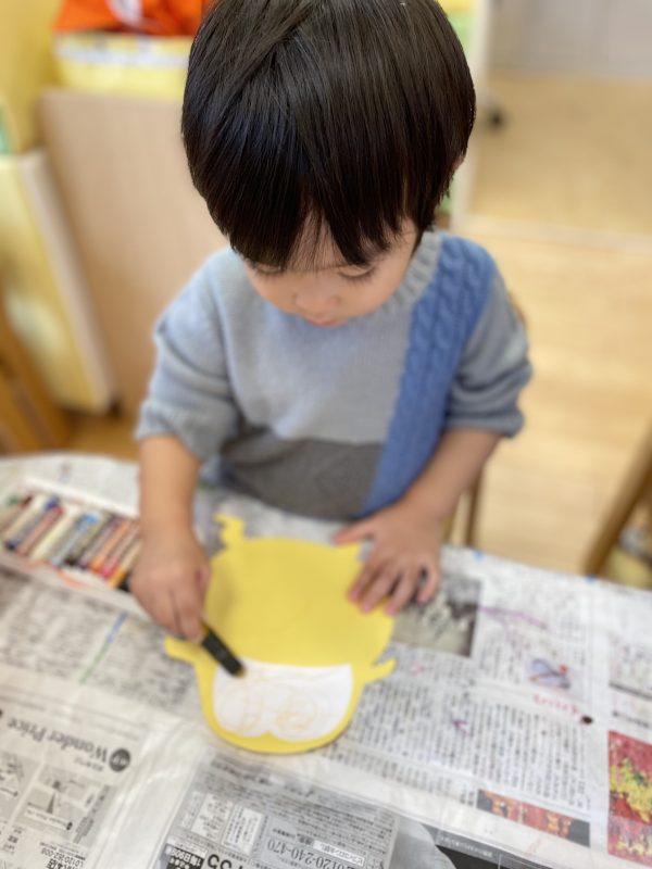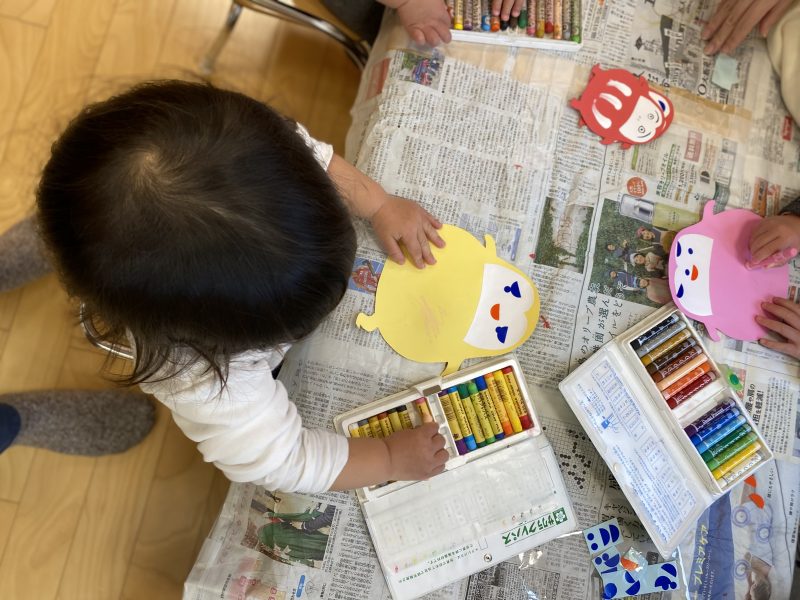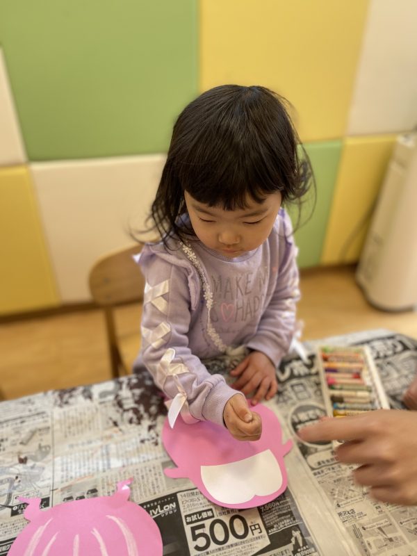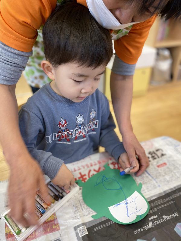 2歳児さんは少しレベルがアップして、全部自分たちでクレヨンを使って書くことにしました
