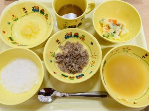 ※りんごは、誤食を防ぐため園では煮りんごにしています。みんな美味しそうにしっかりと噛んで食べることができていました。
