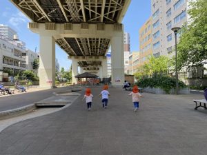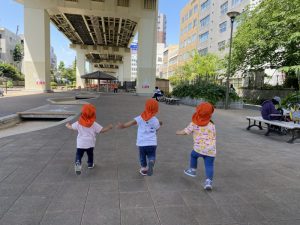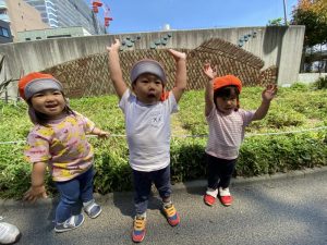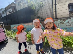 また、この園のある亀戸五丁目周辺をとっても目立つオレンジ色のユニフォーム(笑)で元気いっぱいの子どもたちとほぼ毎日お散歩しておりますので、