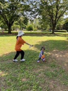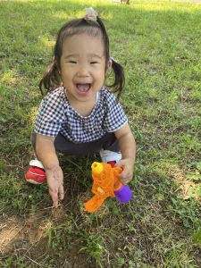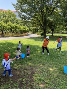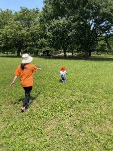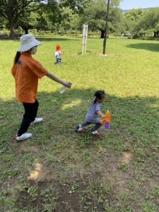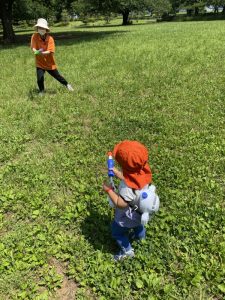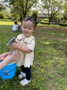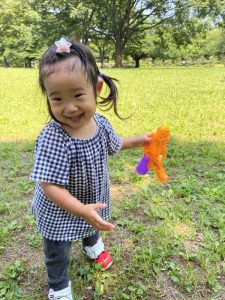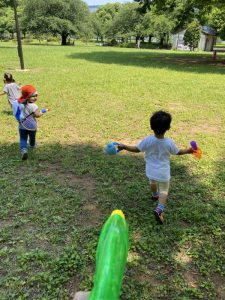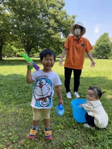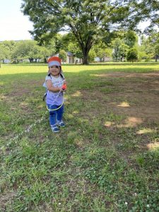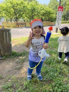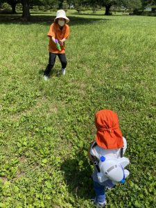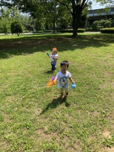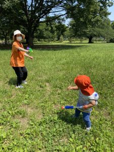 広い芝生の広場へ水鉄砲を持って遊びにやってきました。(*’▽’*)