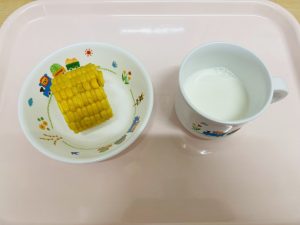 粥 鶏ひき肉と夏野菜の煮物 キャベツのおかか煮 バナナ