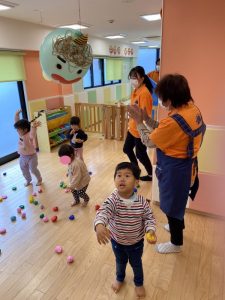 風船のオニさんに豆に見立てた紙のボールをえいっ!!
