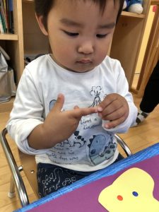 本物の長靴を見せて、「長靴の制作するよ〜」