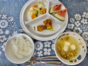 ご飯 味噌汁 鶏ささみのカレー揚げ フレンチサラダ スイカ