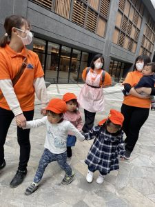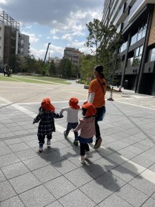 また、この園のある亀戸五丁目周辺をとっても目立つオレンジ色のユニフォーム(笑)で元気いっぱいの子どもたちとほぼ毎日お散歩しておりますので、