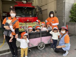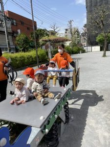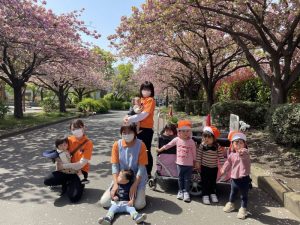 また、この園のある亀戸五丁目周辺をとっても目立つオレンジ色のユニフォーム(笑)で元気いっぱいの子どもたちとほぼ毎日お散歩しておりますので、