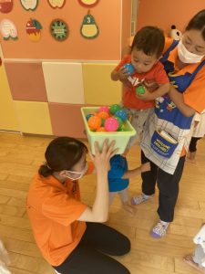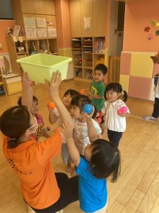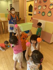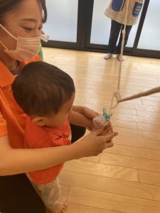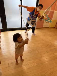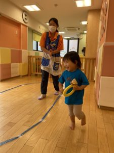 いちご組さんは輪投げの輪っかをバトン代わりにしました。