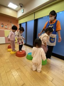 りんごぐみさんは、足をクロスしながらバランスを保って渡ります。