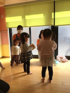一日目は、カリキュラムのリトミックと戸外活動を。