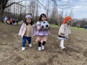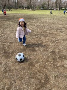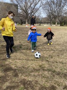 お花見のあとは、広場でサッカーです。