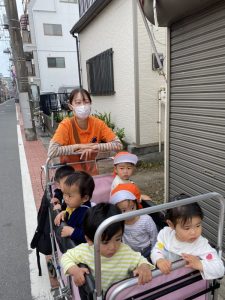 みんな大好きなお散歩は、バギーで出かけます。