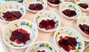 (写真は離乳食後期です。年齢によって形、固さ、盛り付け量を変えて、提供しています。)
