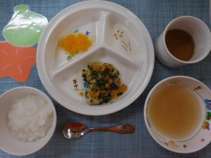 (写真は離乳食後期です。年齢によって形、固さ、盛り付け量を変えて提供しています。)