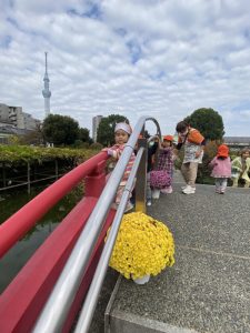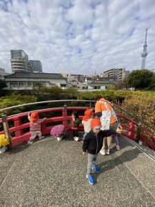 また、この園のある亀戸五丁目周辺をとっても目立つオレンジ色のユニフォーム(笑)で元気いっぱいの子どもたちとほぼ毎日お散歩しておりますので、
