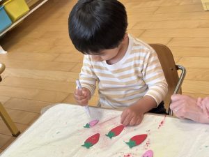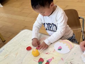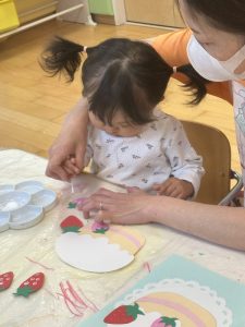2歳児さんは、いちごのつぶつぶは、マーカーを使って描きました。