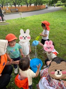 そして、暑くなってきたので木陰で水鉄砲遊びをしました。