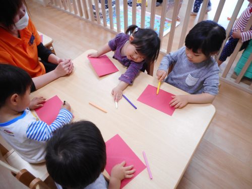 「青い紙と赤い紙をもらって、クーピーペンで描き描きです」