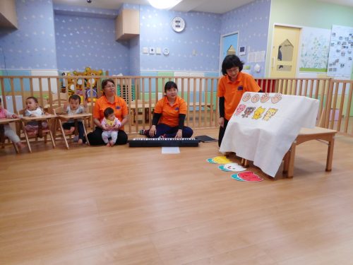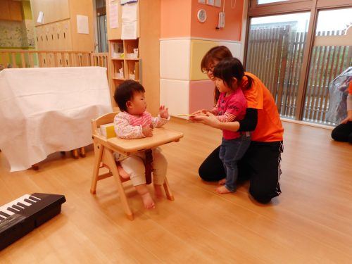保育士の話を聞き、ペンをもらって皆夢中です。