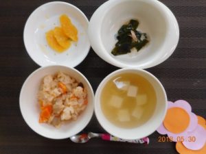<幼児食> *チキンピラフ *豆腐とねぎのみそ汁 *わかめの酢の物 *オレンジ <離乳...