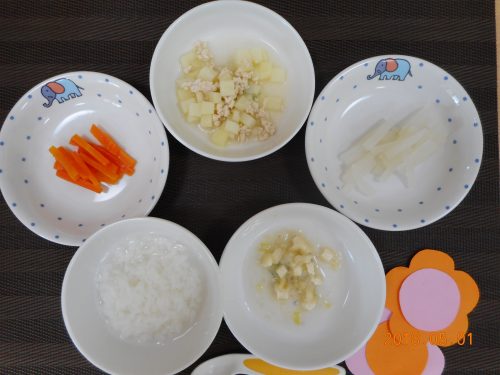 2018.05.01|給食ピックアップ 5月1日(火)のお給食 <幼児食> *ご飯 *筑前煮 *みそ汁 *ほうれん草のごま和え *りんご <離乳食・後期> *おかゆ *鶏ひき肉とじゃが芋のだし煮 *にんじんの煮物 *だいこんの煮物 *みそ汁 前へ 次へ