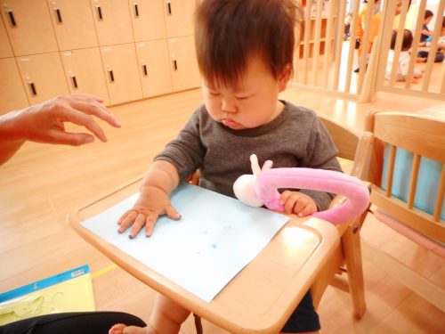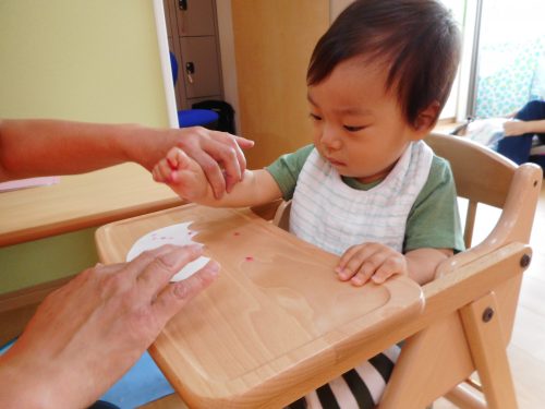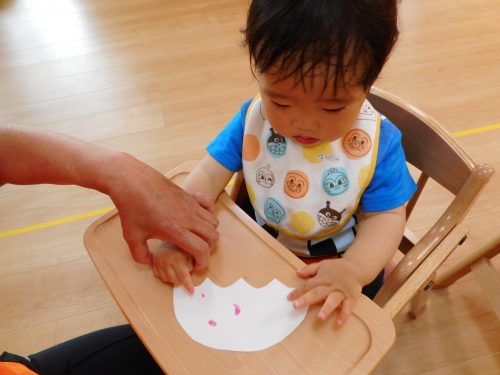 小さな可愛い指で「ペタペタ」☂かさ☂に模様を付けました。