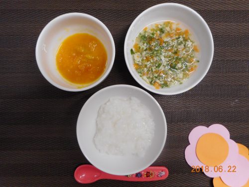 2018.06.22|給食ピックアップ 6月22日(金)のお給食 <幼児食> *ごはん *豚肉のみのしょうが焼き *かぼちゃの煮つけ *けんちん汁 *バナナ <離乳食・中期> *おかゆ *豚肉と野菜のだし煮 *かぼちゃのやわらか煮 *ミルク160cc 前へ 次へ