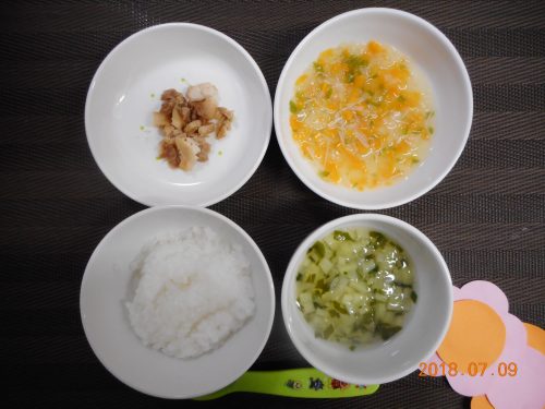 2018.07.09|給食ピックアップ 7月9日(月)のお給食 <幼児食> *ごはん *ジャガイモのみそ汁 *チキンソテーカレー風味 *炒めビーフン <離乳食・後期> *おかゆ *野菜のだし煮 *ビーフンのコンソメ煮 *細切りチキンソテー *ミルク100cc 前へ 次へ