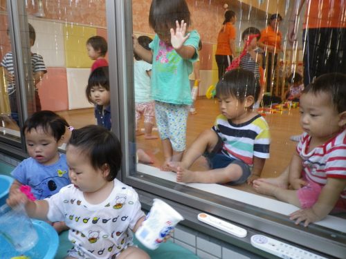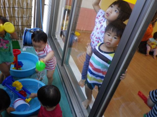 外の水遊びを、室内のガラス窓から見つめるお友だち![]()