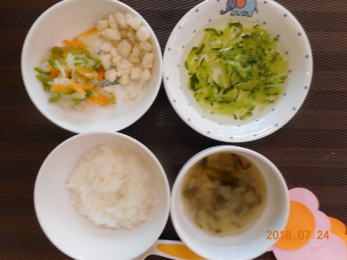 2018.07.24|給食ピックアップ 7月24日(火)のお給食 <幼児食> *ごはん *玉ねぎとわかめのみそ汁 *魚の西京焼き *炒めビーフン *野菜の梅和え <離乳食・後期> *おかゆ *みそ汁 *煮魚 *刻みきゅうり *炒めビーフン *ミルク100cc 前へ 次へ