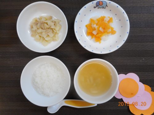 2018.08.20|給食ピックアップ 8月20日(月)のお給食 <幼児食> *ごはん *みそ汁 *豚肉のみそ焼き *ツナポテトの炒め煮 *みかん缶 <離乳食・後期> *おかゆ *みそ汁 *ツナとポテトの煮物 *ゆでにんじん *ミルク100cc 前へ 次へ
