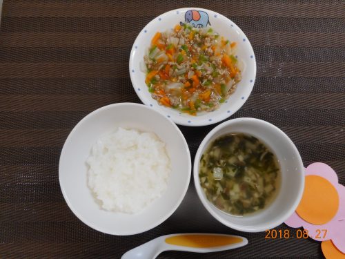 2018.08.27|給食ピックアップ 8月27日(月)のお給食 <幼児食> *ごはん *みそ汁 *しょうが焼き *炒めビーフン <離乳食・後期> *おかゆ *みそ汁 *そぼろ煮 *ミルク100cc 前へ 次へ