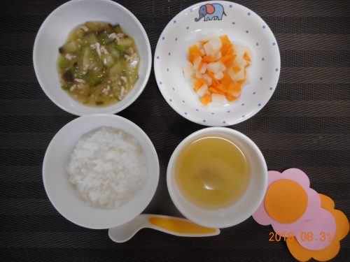 2018.08.31|給食ピックアップ 8月31日(金)のお給食 <幼児食> *ごはん *みそ汁 *なすとひきにくのみそ炒め *ポテトサラダ *飲むヨーグルト <離乳食・後期> *おかゆ *みそ汁 *なすとひきにくのみそ炒め *ゆで野菜 *ミルク100cc 前へ 次へ