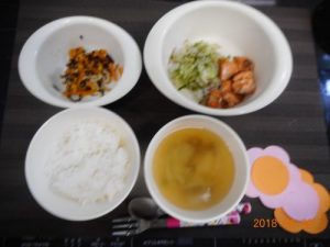 <幼児食> *ごはん *みそ汁 *鮭の和風ムニエル *ひじきの炒り煮 *キャベツときゅうりのゆかり和...