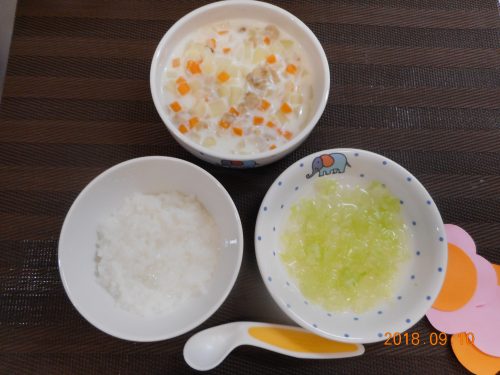 2018.09.10|給食ピックアップ 9月10日(月)のお給食 <幼児食> *パン *チキンクリームシチュー *混ぜまぜサラダ *チーズ <離乳食・後期> *おかゆ *クリームシチュー *キャベツのだし煮 *ミルク100cc 前へ 次へ