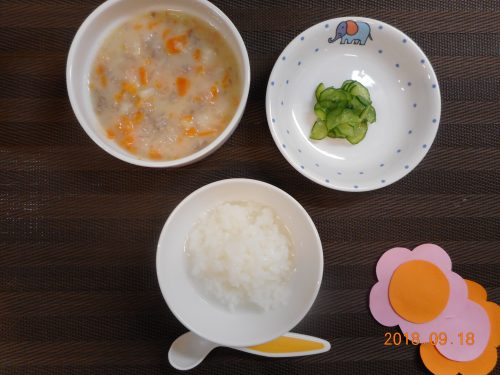 2018.09.18|給食ピックアップ 9月18日(火)のお給食 <幼児食> *ごはん *カレーシチュー *切り干し大根のサラダ *チーズ <離乳食・後期> *おかゆ *シチュー *きゅうりのサラダ *ミルク100cc 前へ 次へ