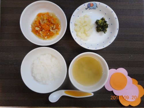 2018.09.20|給食ピックアップ 9月20日(木)のお給食 <幼児食> *ごはん *玉ねぎのみそ汁 *こふき芋 *高野豆腐の卵とじ *おかかあえ <離乳食・後期> *おかゆ *玉ねぎのみそ汁 *こふき芋 *おかか和え *野菜の煮物 *ミルク100cc 前へ 次へ
