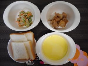 <幼児食> *食パン *鶏肉のマーマレード焼き *ごぼうのサラダ *かぼちゃのポタージュ