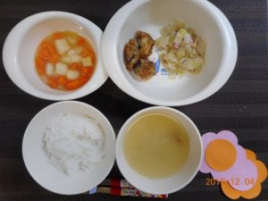 <幼児食> *ごはん *みそ汁 *さばの竜田揚げ *野菜炒め *含め煮