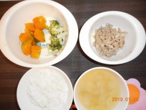 <幼児食> *ごはん *みそ汁 *焼肉 *ブロッコリーマヨネーズかけ *かぼちゃの甘煮