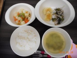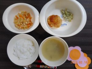 本日はお誕生会献立になります <幼児食> *ごはん *みそ汁 *おひな様サラダ *おかか和え *ボイ...