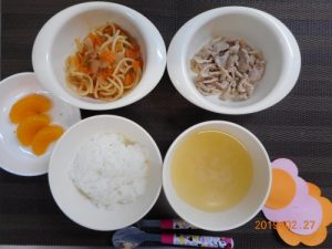 <幼児食> *ごはん *みそ汁 *豚肉のみそ焼き *スパゲティソテー野菜 *みかん缶