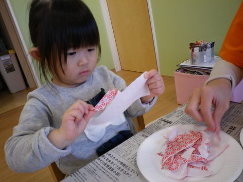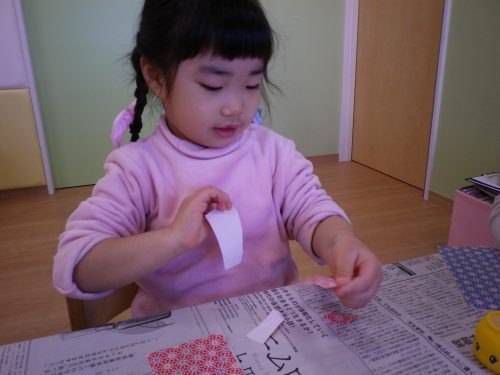ちぎった紙に糊をつけて…