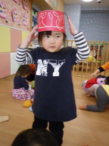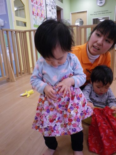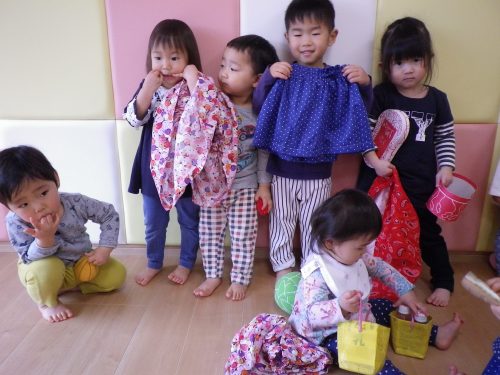 保育士が歌に合わせて、お花の軍手人形を披露しました。